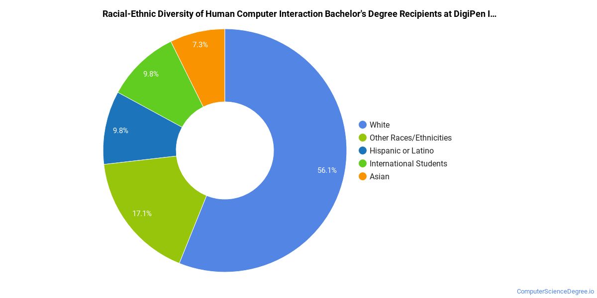 About 56% of those who receive a bachelor's degree in human computer interaction at Digipen are white. This is above average for this degree on the nationwide level.