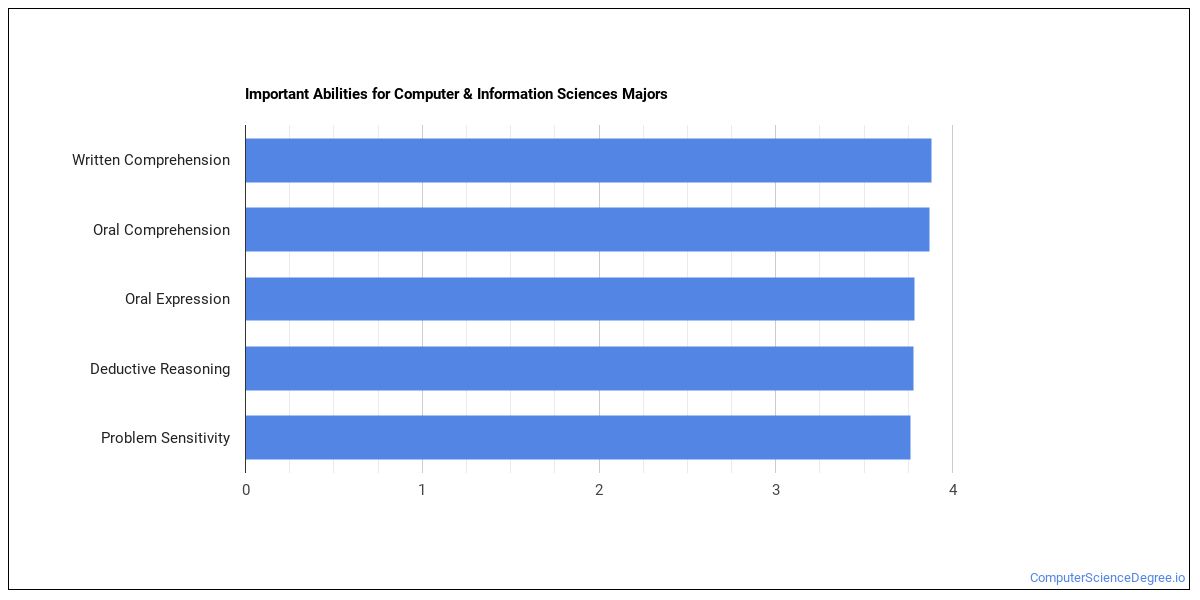 People with careers related to computer and information sciences were asked what knowledge areas, skills, and abilities were important for their jobs. They weighted these areas on a scale of 1 to 5 with 5 being the highest.